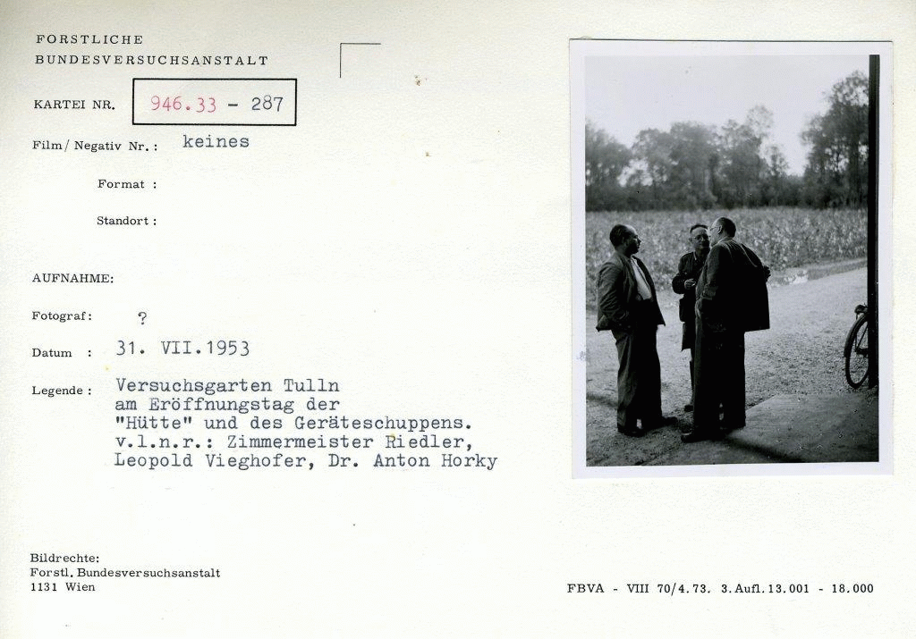 - TitelVersuchsgarten Tulln am Eröffnungstag der "Hütte" und des Geräteschuppens. v.l.n.r.: Zimmermeister Riedler, Leopold Vieghofer, Dr. Anton Horky