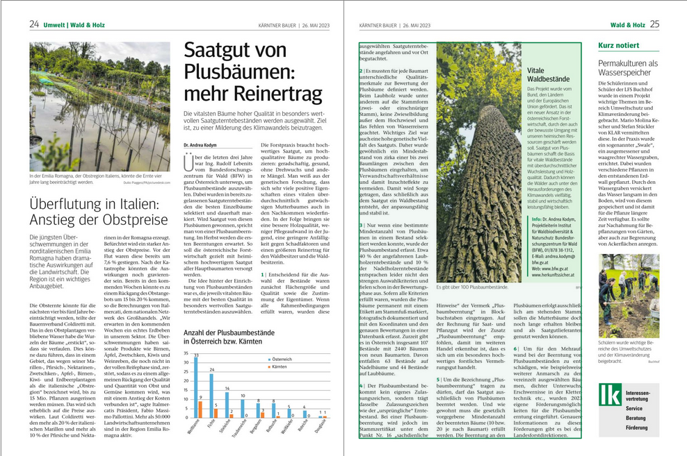 Die vitalsten Bäume hoher Qualität in besonders wertvollen Saatguterntebeständen werden ausgewählt. Ziel ist, zu einer Milderung des Klimawandels beizutragen. Über die letzten drei Jahre war Ing. Rudolf Lebenits vom Bundesforschungszentrum für Wald (BFW) in ganz Österreich unterwegs, um Plusbaumbestände auszuwählen. Dabei wurden in bereits zugelassenen Saatguterntebeständen die besten Einzelbäume selektiert und dauerhaft markiert. Wird Saatgut von diesen Plusbäumen gewonnen, spricht man von einer Plusbaumbeerntung. Im Herbst werden die ersten Beerntungen erwartet. So soll die österreichische Forstwirtschaft gezielt mit heimischem hochwertigem Saatgut aller Hauptbaumarten versorgt werden.