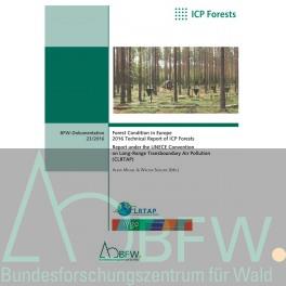 ICP Forests is one of the most diverse programmes within the Working Group on Effects (WGE) under the Convention on Long-range Transboundary Air Pollution (CLRTAP). To provide a regular overview of the major results of the programme, the Programme Co-ordinating Centre (PCC) of ICP Forests yearly invites all ICP Forests Expert Panels, Working Groups, and Committees to publish a comprehensive chapter on their most recent results in the annual ICP Forests Technical Report. This 2016 Technical Report presents results of the ICP Forests 2015 large-scale (Level I) and 2014 intensive (Level II) forest monitoring from up to 32 of the 42 countries participating in ICP Forests. It focuses on: - a description of the monitoring and research infrastructure of ICP Forests; - tree crown condition and damage causes in 2015 including trend analyses; - the spatial variation of atmospheric throughfall deposition in forests in Europe in 2014; - the spatial and temporal distribution of ozone symptoms across Europe from 2002 to 2014; - the water, soil, and foliage ring tests within the quality assurance and control programme to guarantee the comparability of the analytical results between different laboratories; - a description of the ICP Forests Level I biodiversity data on plant species and structural diversity in European forest ecosystems. This year all ICP Forests Expert Panels, Working Groups, and Committees have additionally provided a concise description of their latest activities and outcomes in their specific field of study. The report also includes numerical results and national reports of the 2015 national crown condition survey in the participating countries. It contains information on the 4th ICP Forests Scientific Conference in Ljubljana in May 2015 and lists all 48 ICP Forests projects ongoing for at least one month between June 2015 and May 2016 and 28 scientific publications between January 2015 and May 2016 for which ICP Forests data and/or the ICP Forests infrastructure were used. For additional maps, tables, figures, and contact information of persons responsible, please refer to the extensive annex at the end of this report. THE MONITORING AND RESEARCH INFRASTRUCTURE OF ICP FORESTS ; TREE CROWN CONDITION AND DAMAGE CAUSES ; SPATIAL VARIATION OF ATMOSPHERIC DEPOSITION IN EUROPE IN 2014 ; SPATIAL AND TEMPORAL DISTRIBUTION OF OZONE SYMPTOMS ACROSS EUROPE FROM 2002 TO 2014 ; RING TESTS AS MAIN PARTS OF THE QUALITY ASSURANCE AND CONTROL PROGRAMME FOR THE COMPARABILITY OF ANALYTICAL DATA ; THE ICP FORESTS LEVEL I BIODIVERSITY DATA ; ACTIVITIES RELATED TO ICP FORESTS OF THE EXPERT PANELS, WORKING GROUPS, AND COMMITTEES ; REVIEW OF THE 4TH ICP FORESTS SCIENTIFIC CONFERENCE, LJUBLJANA, 19-20 MAY 2015 ; ONGOING ICP FORESTS PROJECTS ; SCIENTIFIC ICP FORESTS PUBLICATIONS IN 2015/16 ; NATIONAL REPORTS ON THE 2015 NATIONAL CROWN CONDITION SURVEYS ; TREE CROWN CONDITION AND DAMAGE CAUSES – ADDITIONAL MAPS (CHAPTER 3) ; RESULTS OF THE NATIONAL CROWN CONDITION SURVEYS (CHAPTER 12) ; LIST OF WOODY SPECIES (CHAPTER 5)