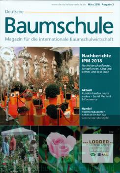 - AbstractGaLaBau auch 2017 mit Umsatzplus; Ilex crenata invasiv? ENA-Generalversammlung in Essen; IVG Medientag Garten in Köln; Baumschultag in Veitshcöhheim: Social Media & E-Commerce; Zeitenschwelle im Baumschulmarkt; BDB-Landesverbände Sachsen und Thüringen; Neue Düngeverordnung; IPM 2018: Überragend positive Stimmung; Jungpflanzenbetriebe; Obstbaumschulen: Vitamine für jeden Bedarf; Navigationshilfen im Beeren-Dschungel; Serie zu gebietsheimischen Gehölzen Teil 2.