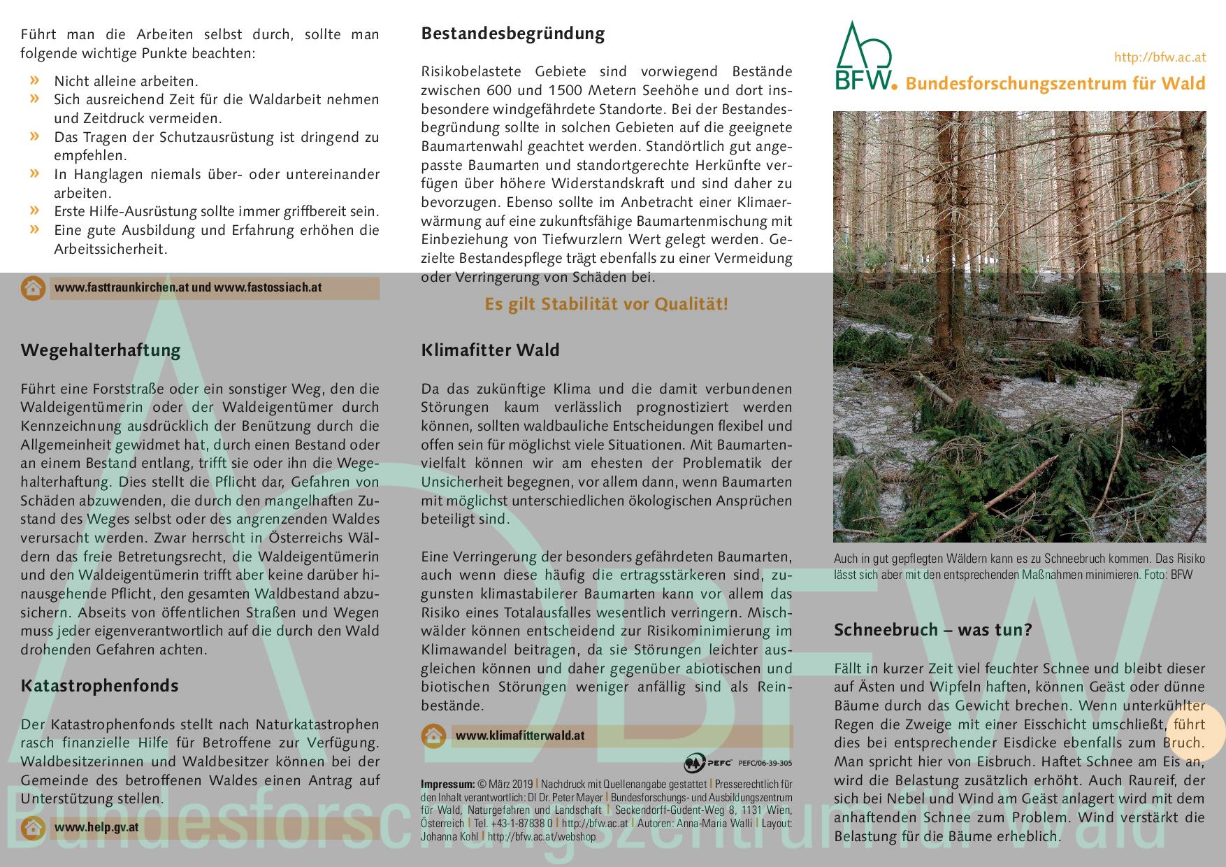 Fällt in kurzer Zeit viel feuchter Schnee und bleibt dieser auf Ästen und Wipfeln haften, können Geäst oder dünne Bäume durch das Gewicht brechen. Wenn unterkühlter Regen die Zweige mit einer Eisschicht umschließt, führt dies bei entsprechender Eisdicke ebenfalls zum Bruch. Man spricht hier von Eisbruck. Haftet Schnee am Eis an, wird die Belastung zusätzlich erhöht. Auch Raureif, der sich bei Nebel und Wind am Geäst anlagert wird mit dem anhaftenden Schnee zum Problem. Wind verstärkt die Belastung für die Bäume erheblich.